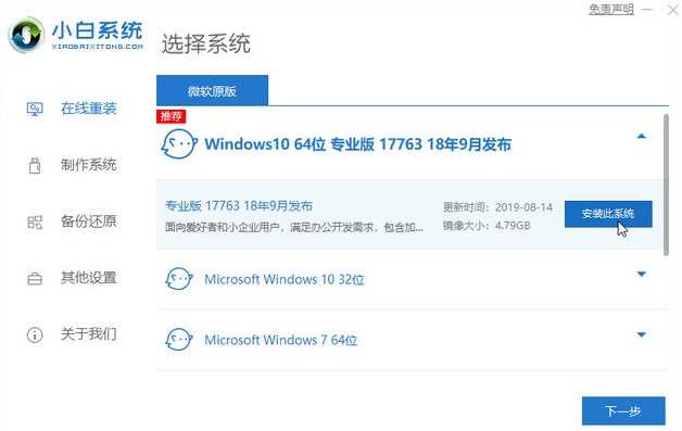 1.下载一个小白一键重装软件,打开软件后选择我们想安装的系统。