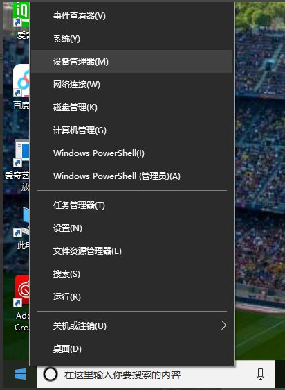 1.右键启动菜单。按一下设备管理。