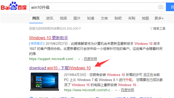 1、百度搜索“win10升级”,选择微软官方页面进入。