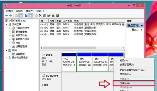 2、接下来需要找一个并且剩余空间较大的分区,在其上右键单击,在弹出的菜单中选择“压缩卷”,如下界面图所示。