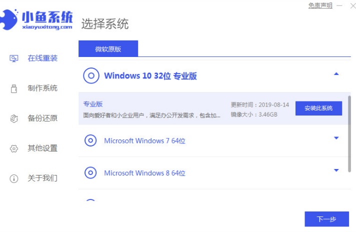 1.首先下载安装小鱼一键重装系统工具,下载后打开后选择win10专业版系统点击“安装此系统”;