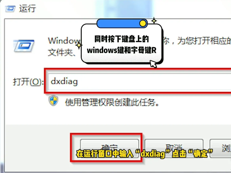 1、同时按下键盘上的windows+R,在运行窗口中输入“dxdiag”按下回车键确认。