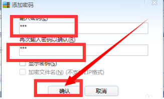 3、在添加密码界面输入要加密的密码,确认密码后点击确定,即可开始压缩。