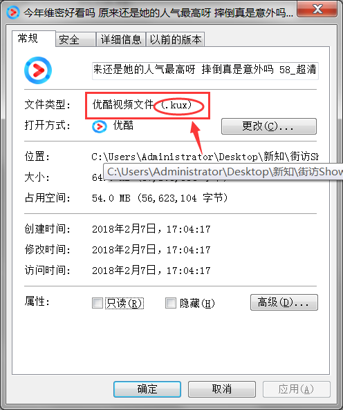 2、然后下载的视频属性,在常规属性中,会发现文件的类型是kux格式