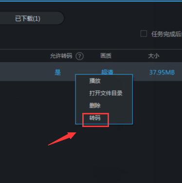 4、文件中找到需要转换为MP4格式的优酷超清视频后,在该视频栏单击鼠标右键,选择(转码),在转码中进行设置