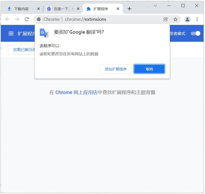 5、这时出现提示窗要添加Google翻译吗的界面,我们点击“添加扩展程序”按钮。