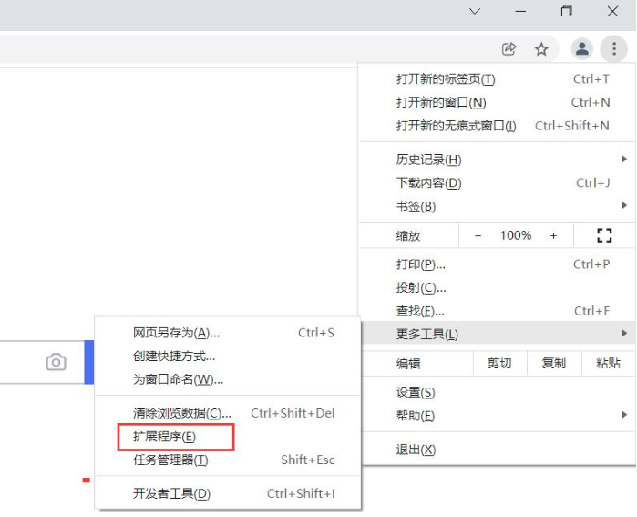 2、打开谷歌浏览器,点击右上角的三点——更多设置——扩展程序。