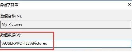 3、双击打开右侧的“My Pictures”,将数值数据修改为:%USERPROFILE%Pictures ,点击确定重置截图保存路径即可。