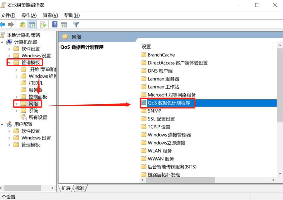 2.依次点击【管理模板】、【网络】、【Qos数据包计划程序】。