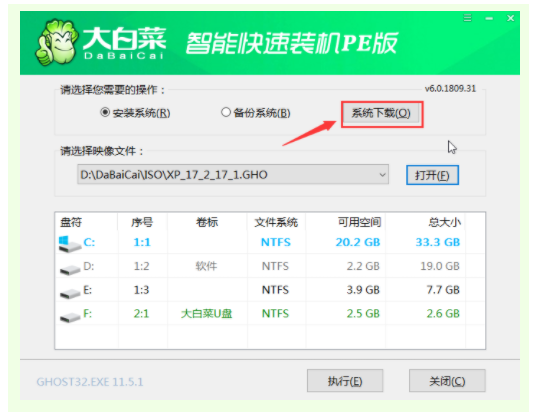 4、打开大白菜一键重装后,选择右上角在线系统下载。