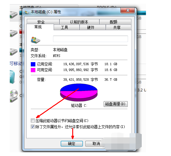 7、也可以在属性页中选中压缩驱动器来节约磁盘空间,通过这种方法可以一定程度上节约空间。