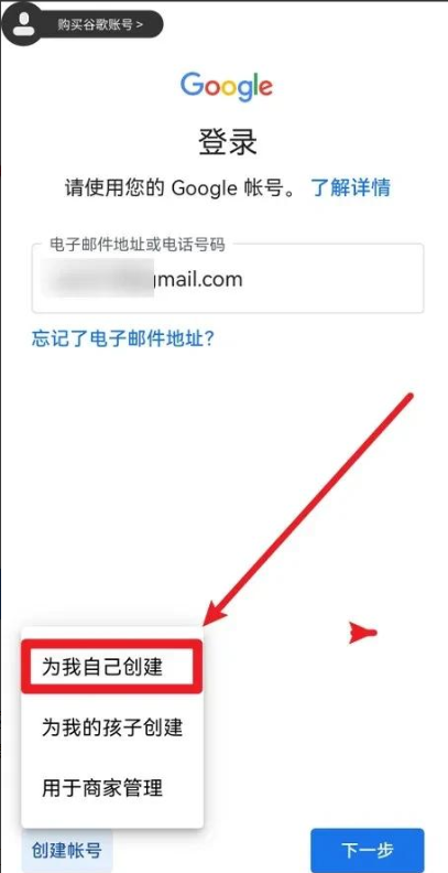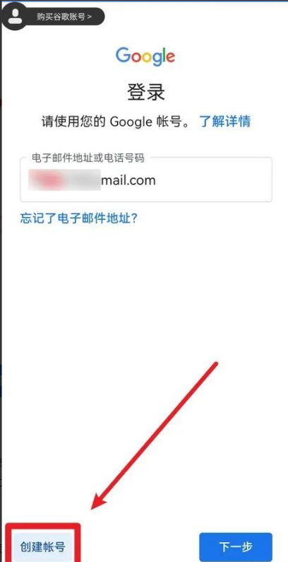 7、返回到刚才的谷歌账号登录页面,页面的左下角就多出来一个 “创建账号” 的选项。