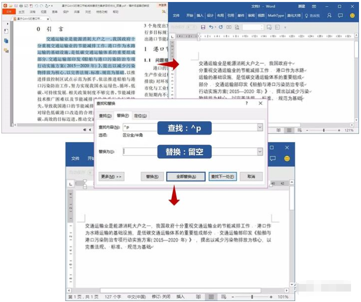 如果接收到的PDF可以复制,并且我们只需要局部内容粘贴到word的话,那就直接复制粘贴想要的内容,不过可能大家发现粘贴到word后段落支离破碎,一行就是一段。别担心,只需选中这段内容,然后按 【Ctrl + H】,打开替换对话框,把 ^p 全部替换成无即可。