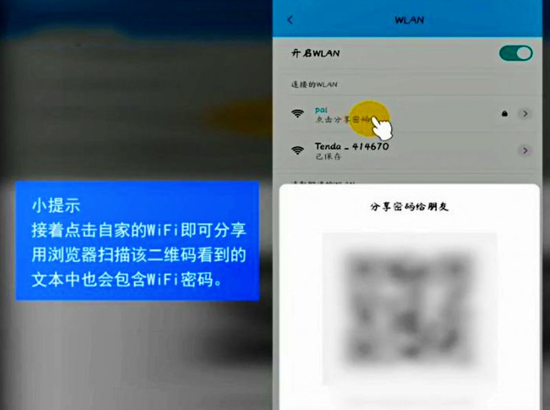 2、点击家里的WiFi进行分享,然后我们再用手机自带的扫描工具识别扫描该二维码,这样就可以看到WiFi密码信息了。