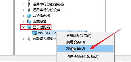 2.在安全模式下,右键单击我的电脑--属性--设备管理器,找到显示适配器,右键单击显卡驱动选择卸载。然后重启正常进入系统后,再重新安装显卡驱动(通过驱动精灵安装)。