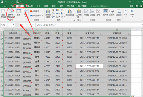2、选中整个表格,点击【插入】,这时有两种选择,其中一种是【推荐的数据透视表】,这是由excel根据表格数据推荐生在的透视表;