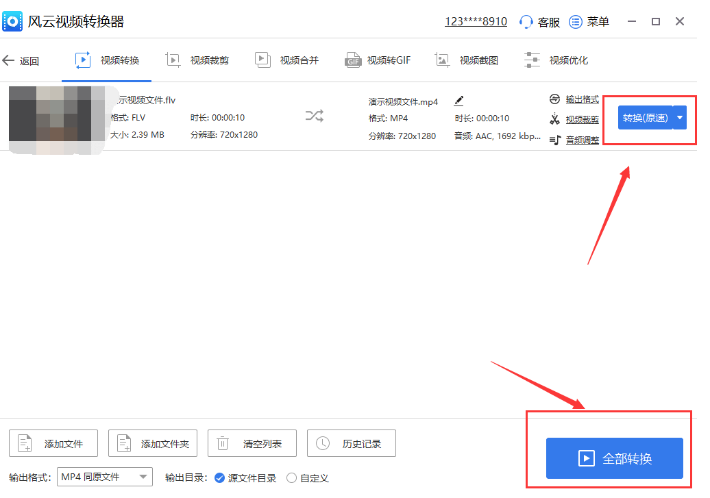 7、转换模式设置好以后,点击“全部转换”,或者“转换”按钮,即可将哔哩哔哩下载的视频进行MP4的转换了。