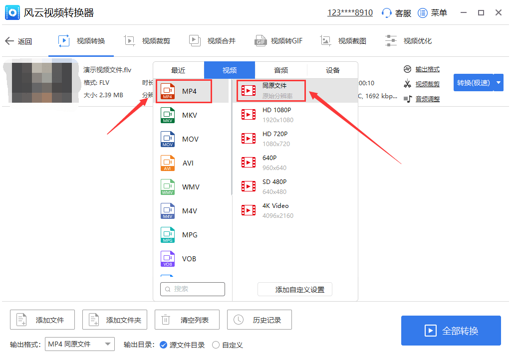 5、随后在弹出的格式输出选择的窗口中点击“MP4”,转换的分辨率选择为“同原文件”,如有需要其他分辨率的可按照自身的需要进行选择。