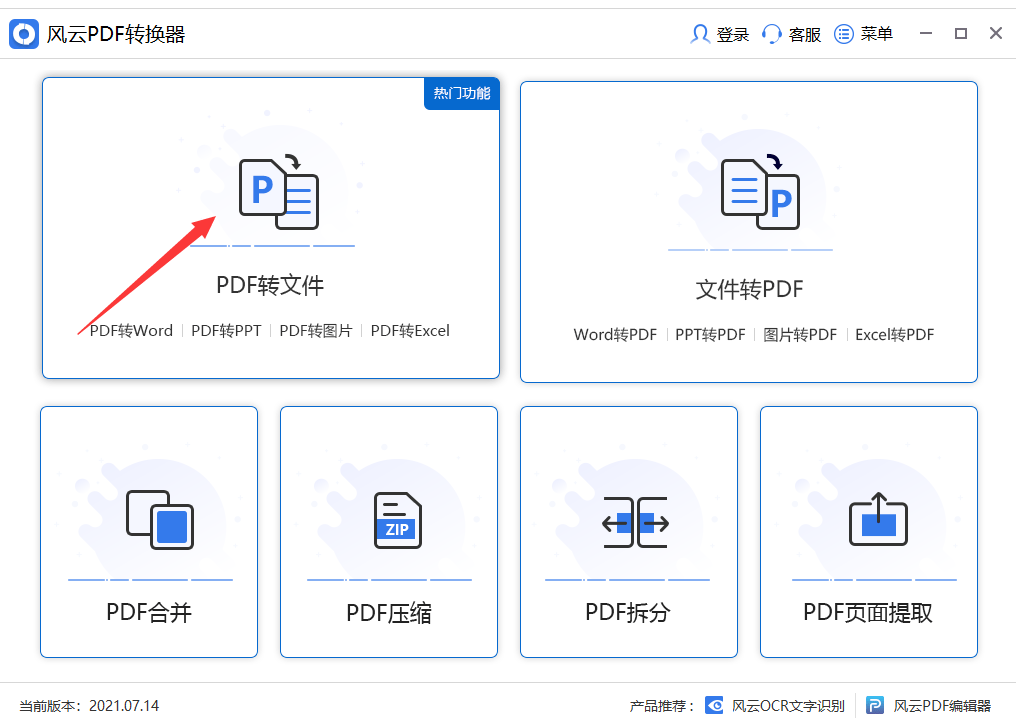 1、 首先下载并安装风云PDF转换器,随后打开软件,选择“pdf转文件”功能。