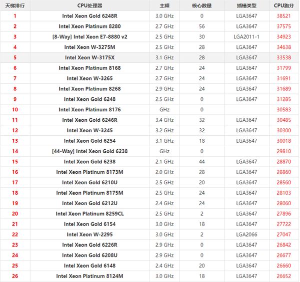 2021最新英特尔至强系列cpu天梯图