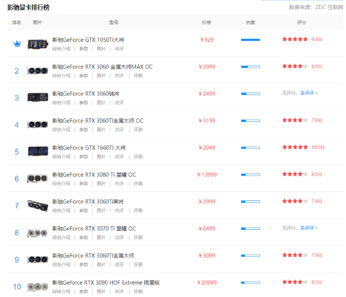 影驰显卡系列高低排行榜单