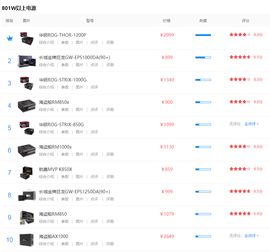 801W以上电源排行榜