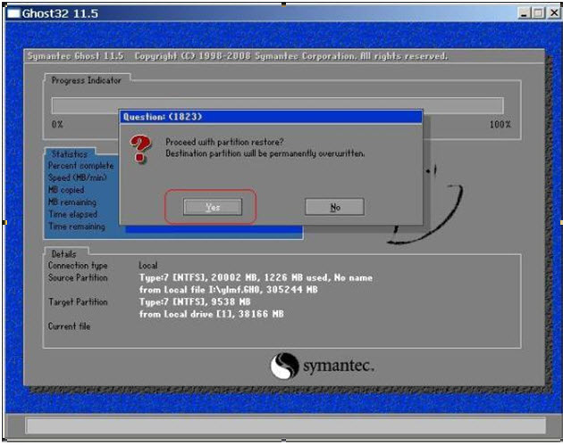 c.如上图,找到事先准备好的GHO文件(注意:Ghost文件要放在磁盘的根目录),选定后点open(打开),弹出界面如下图:
