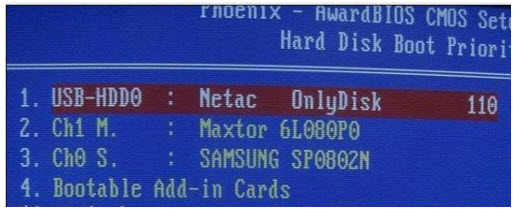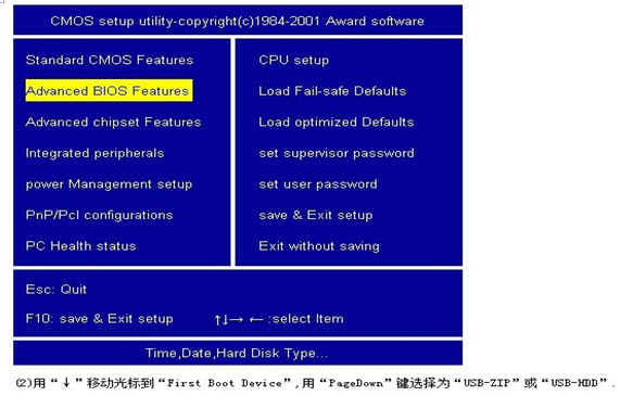 先插上U盘,再打开或重启电脑,1.在系统自检的界面上按 Del 键进入 BIOS 设置,2.进入 First Boot Device 使用“+”将启动顺序设定为USB-HDD图1:3.有些主板把 U 盘认成硬盘, 则在 Hard Disk Boot Priority 中选择如下图2,设定好后按ESC 一下,退回 BIOS 主界面,选择 Save and Exit 回车确认退出 BIOS 设置。电脑重启后就会出现主菜单。有些机器,特别是笔记本和品牌机有设置启动顺序的快捷键(如联想的机器开机的时候按F12键),选择从 usb 设备启动就行了。
