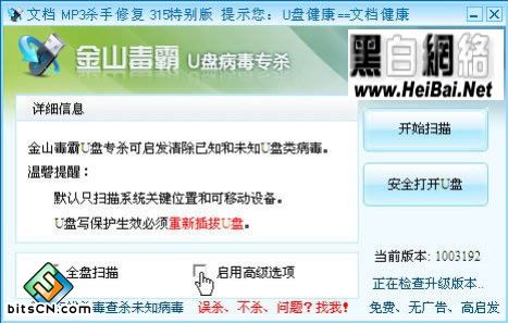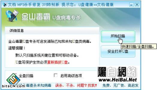 金山U盘病毒专杀可启发清除已知和未知的U盘病毒,用户只需点击界面右侧的“开始扫描”按钮即可运行扫描程序,如图所示。