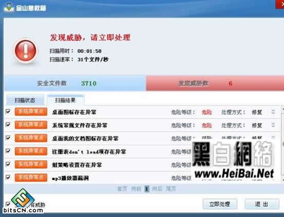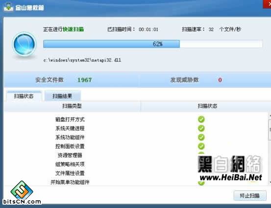 金山急救箱采用全新的云安全技术,扫描速度极快,可以帮助用户快速诊断系统是否中毒,强力查杀顽固和未知木马,将系统和上网环境恢复如初,如图所示。