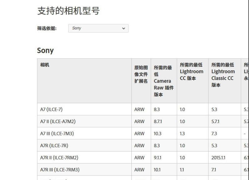1.首先去camera raw官网找到自己的相机型号。