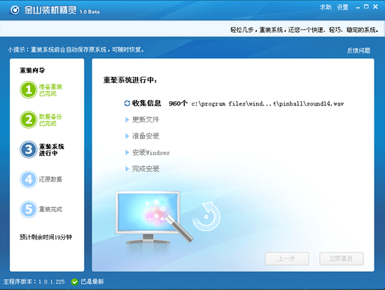 第五步:在还原数据之后,重装系统完成,此时需要您重启下电脑。另外您还可以使用金山装机精灵的其他功能:装驱动、装软件、打补丁。