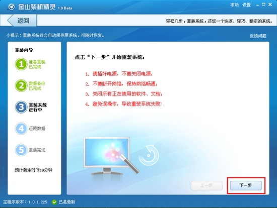 第三步:数据备份完成,进入重装系统阶段。此时请不要断开电源,保持网络链接正常,并且关闭所有正在使用的软件及文档。点击“下一步”,开始重装系统。