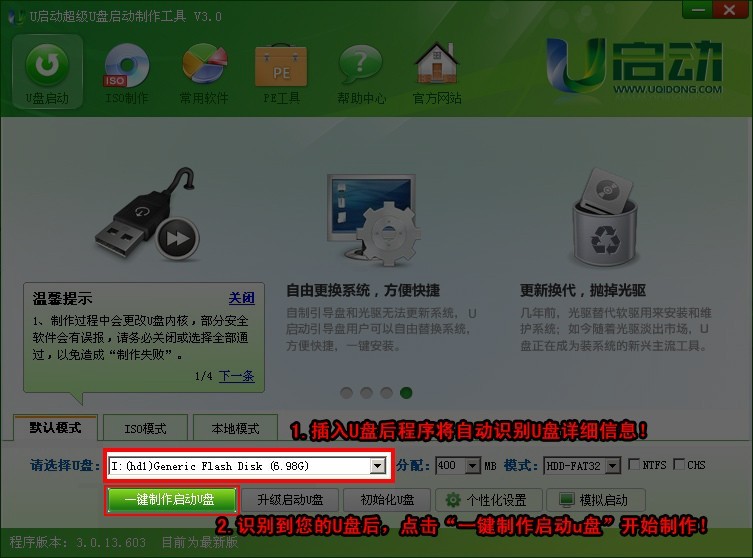 继续上面的操作,我们现在插入需要制作启动盘的U盘,U启动将会自动识别U盘详细信息,如下图: