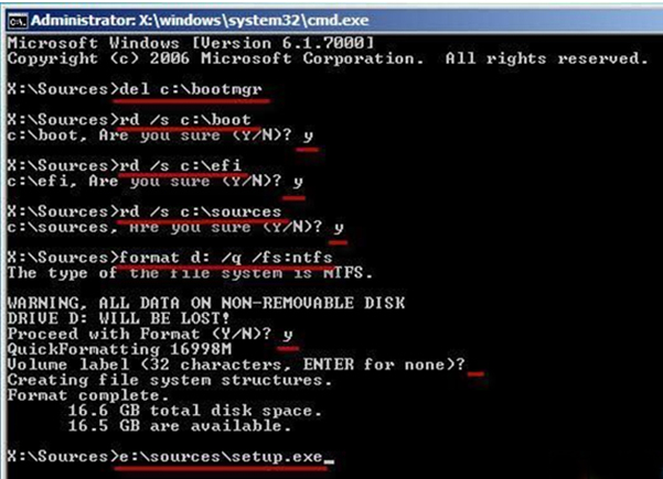 3、清理启动文件:为避免装Win7 时启动文件混乱导致失败,务必删除原来拷贝到C盘的bootmgr文件和boot、efi、sources文件夹。分别在命令行窗口键入命令并按回车: