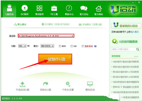 2、安装完成后,插入U盘,选择”一键制作U盘“,弹出框选择”确定“,然后开始制作。u盘启动盘制作完成后会弹出一个是否进入“电脑模拟器”测试u盘的启动情况,我们选择”否“,然后退出软件,这时我们在”计算机“会看到,U盘的名字已经变成"U盘启动盘"了。