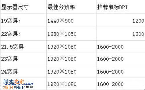下面的图表是本站为用户推荐的显示器尺寸对应的最佳分辨率和推荐鼠标DPI: