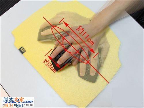 假设鼠标的定位引擎位于鼠标的中间位置,那么,经过测量,我们发现靠手腕来摆动鼠标,鼠标引擎的最大移动距离大约有11厘米。不过,除了激烈游戏外,日常操作中我们很少会这样大幅度地摆动鼠标,因为这样容易造成腕部的疲劳。因此,比较舒服的鼠标操作的摆动范围是上图中间小弧形范围,笔者试验结果大约是3厘米,也就是比一英寸稍长一点。(此数据以笔者的手来估量,仅供参考)