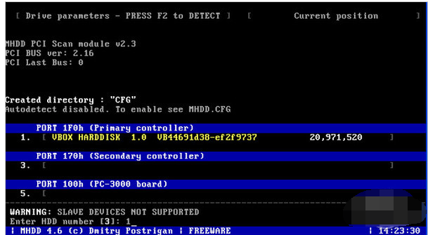 成功进入MHDD软件界面,下面位于第一项的是要检测的硬盘,输入数字“1”后按下回车键。
