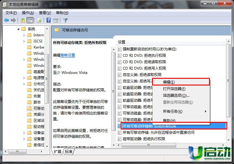 2、在打开的本地组策略编辑器中,依次展开“计算机配置——管理模块——系统——可移动存储访问”,然后在右边的设置列表中找到“所有可移动存储类:拒绝所有权限”,单击鼠标右键在弹出的选项中点击“编辑”;
