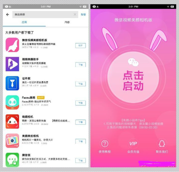 首先我们在腾讯应用宝搜索微信视频美颜,我们会搜索到微信视频美颜相机版,这款软件可以完美的实现我们微信视频聊天美颜的需求,但是这款软件只能试用30分钟,如果后期依然想要就需要付费了。