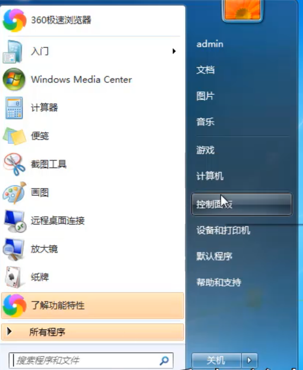 1.鼠标单击左下角开始菜单,选择控制面板。