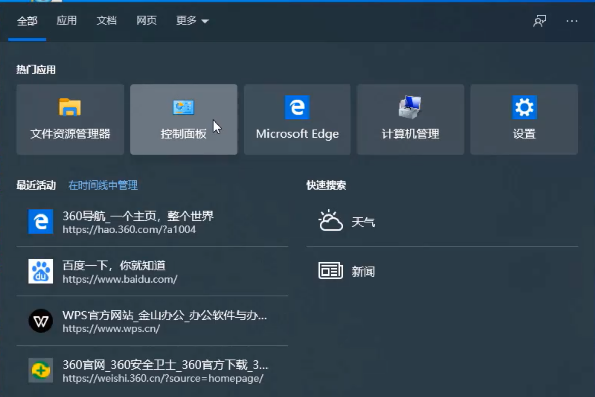 1.按下组合键win+s,在搜索栏输入控制面板并打开。