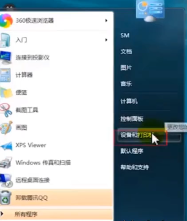 1.首先打开开始菜单,进入设备和打印机。