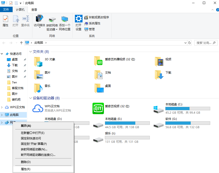 1、双击打开此电脑,右击左侧的网络选择属性。