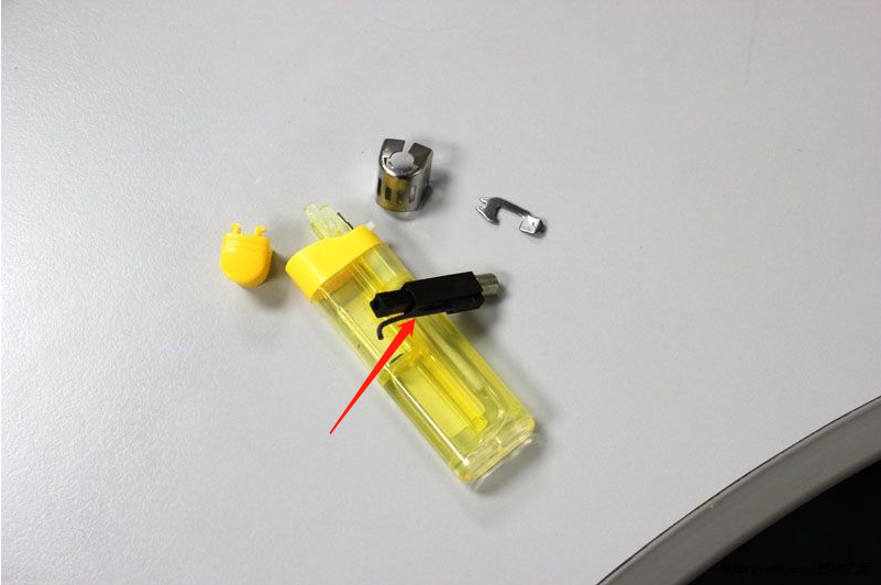 1、首先,我们准备一个普通的火机,将火机的电子拆出来(黑色的那个)。