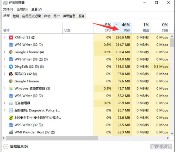 1. 内存不足就是电脑死机的最大凶手,按下Ctrl+Shift+Esc键,打开任务管理器,点击内存,查看占用内存最多的程序。