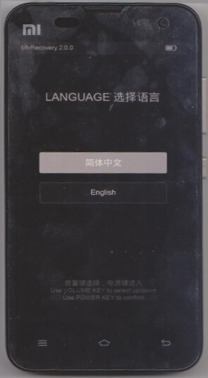 1、手机关机,同时按住音量减键和电源键,重启后手机进入recovery模式。选中简体中文,按下电源键进入下一步。