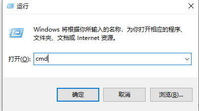 1、首先打开 Win10 运行命令,可以在开始菜单中打开,也可以直接使用组合快捷键 「Win + R」快速打开,打开运行命令窗后,在打开后面键入 cmd 并点击确定进入。