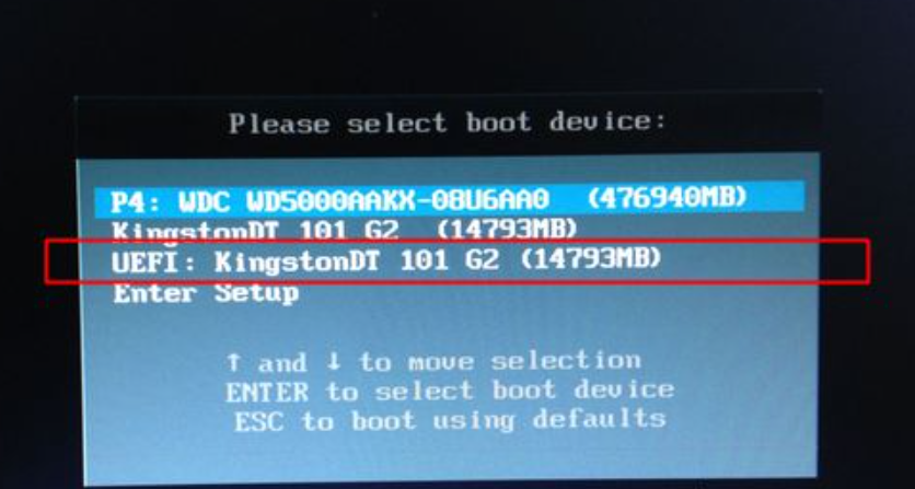 1、在可用电脑上制作uefi pe启动盘之后,在忘了密码的电脑上插入U盘,启动电脑之后,不停按F12或F11或Esc或F7等快捷键调出启动菜单,需根据不同品牌电脑选择启动热键,然后按方向键选择识别到的U盘,比如KingstonDT 101 G2。如果是uefi机型,则要选择uefi开头的项,按回车进入;